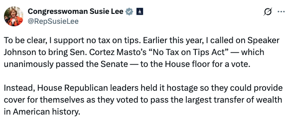 Nevadans aren’t fooled by Susie Lee’s pathetic backpedaling. She sold out Nevada workers by voting against “No Tax on Tips”, marching in lockstep with her radical party bosses. Now that she’s getting burned for it, she’s desperately trying to rewrite history with a cowardly tweet: