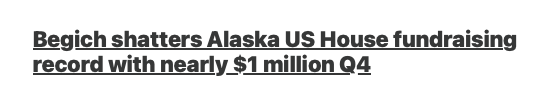 Congressman Nick Begich announced that his campaign brought in a massive fundraising haul of nearly $1 million in Q4, setting a new record for off-year fundraising by any U.S. House candidate or incumbent in Alaska history.