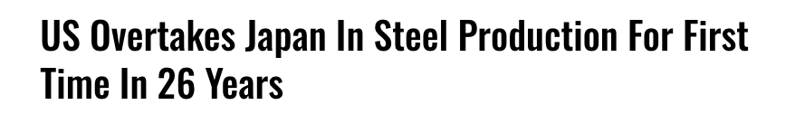 Despite out of touch Democrat Frank Mrvan standing in the way, the “United States produced 82.0 million tons of steel in 2025, up 3.1% from the previous year.” This marks the first time in nearly three decades that the “U.S. outpaced Japan in crude steel production.”