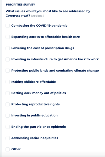 In her recent campaign email, Kim Schrier asked supporters to choose which issues they want her to prioritize.