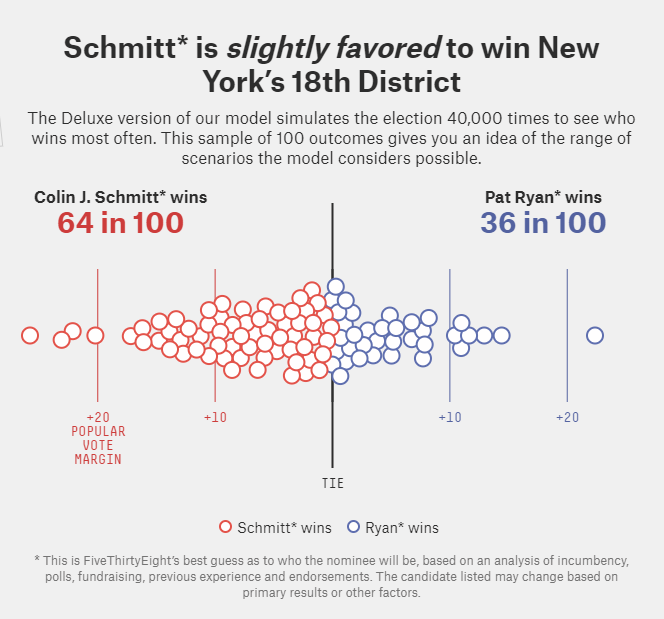 FiveThirtyEight released their 2022 House forecast and they say Colin Schmitt is favored to beat Pat Ryan in NY-18 in November: