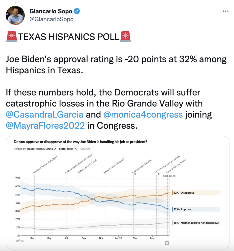 NRCC Comment: “Hispanic voters in Texas are running away from Democrats because their failed agenda has sent prices soaring and left the southern border wide open.” –NRCC Spokeswoman Torunn Sinclair
