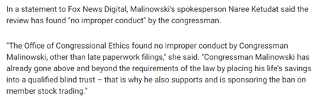 But on Friday, the House Committee on Ethics cleared several members of Congress from failing to properly disclose their stock trades – and Malinowski was notably left off the list.
