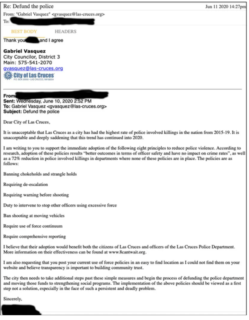 “I wholeheartedly and absolutely support police reform and the #blacklivesmatter movement, and will not be stopping short of transformational reform that brings justice to our city and to people of color in our community. You can count on my support,” Vasquez wrote to a constituent demanding “at least” a 50% reduction of the Las Cruces police department budget.