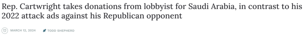 It’s been revealed that Matt Cartwright has been accepting donations from a lobbyist for Saudi Arabia, even though he attacked his opponent with a barrage of TV ads in 2022 for doing the same exact thing.
