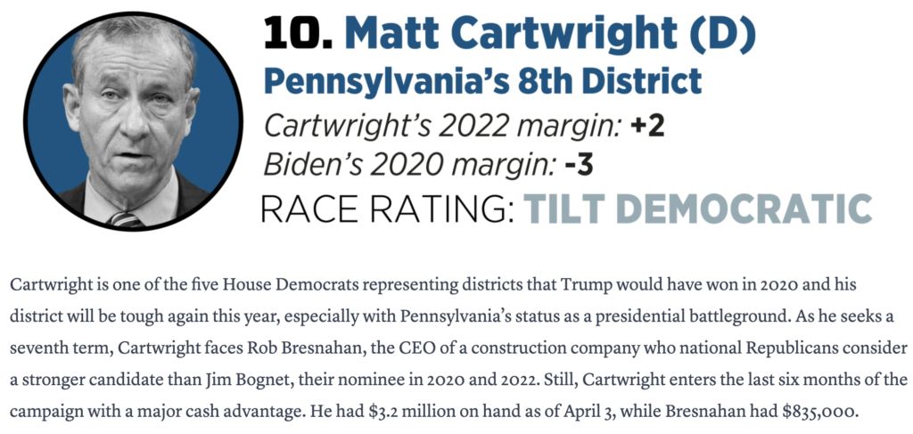 Cartwright joins the national “Most Vulnerable” list for the first time, citing his district “will be tough again this year, especially with Pennsylvania’s status as a presidential battleground.”