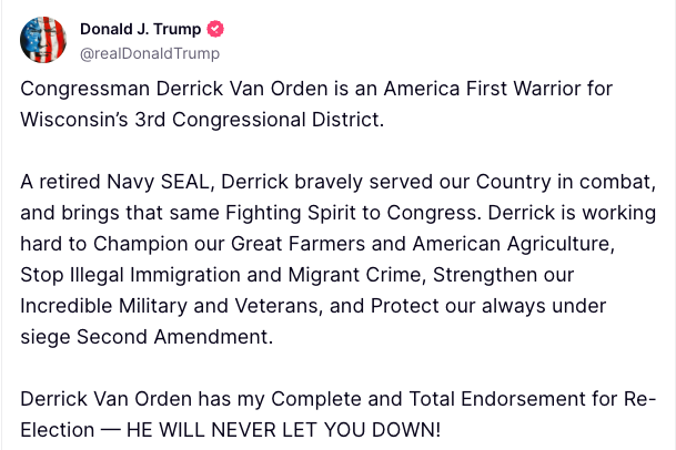 “President Trump’s powerful endorsement adds to Representative Derrick Van Orden’s growing momentum for 2026. Representative Van Orden has been hard at work, delivering a secure border, safer streets, and lower costs for Wisconsinites – and he’s not letting up.” – NRCC Spokesman Zach Bannon