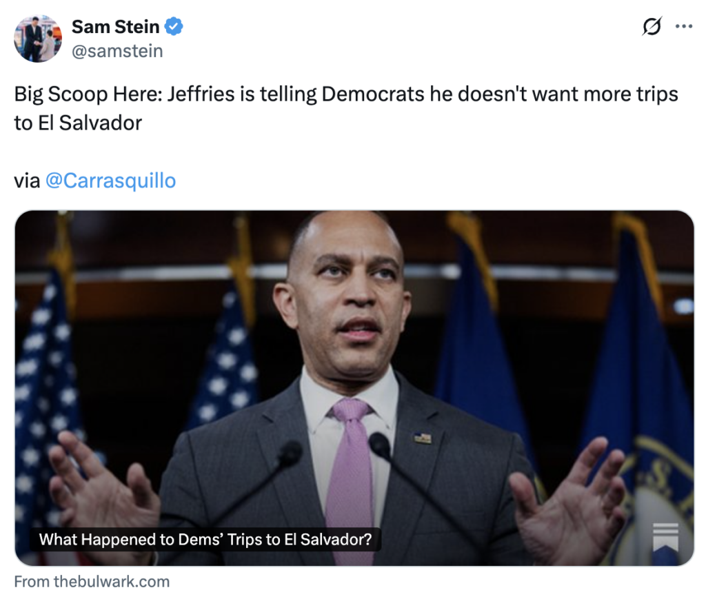 Reminder: This fiasco comes after Jeffries dodged questions about the trip, House Democrats were caught using the trip as an opportunity to vacation at a luxury resort in El Salvador, and the NRCC offered to buy their plane ticketsunder the condition that they snap lots of selfies (House Democrats: Our offer still stands!).