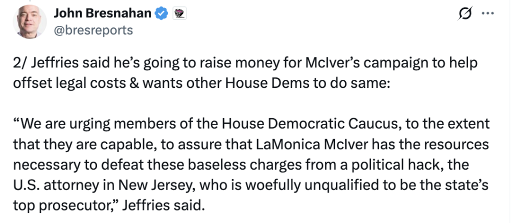 Democrat ‘leader’ Hakeem Jeffries is urging Democrats to raise money to defend LaMonica McIver who forcibly impeded and interfered with federal law enforcement officers while supporting criminal illegal immigrants.