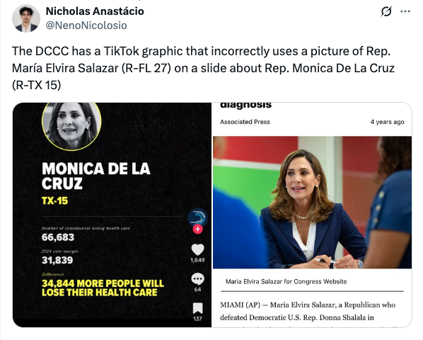 Another day, another example of just how out of touch Democrats are. The DCCC just humiliated itself after using a photo of Florida Congresswoman Maria Salazar to attack Texas Congresswoman Monica De La Cruz.
