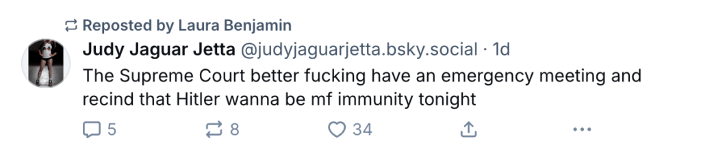 Laura Benjamin amplified a post calling President Trump a ‘Hitler wannabe mf‘ and Emily Berge claimed the targeted strikes were ‘to fuel Trump’s ego and further the wealth divide in this country.’