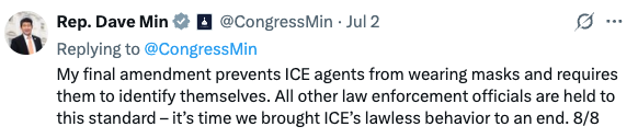 Min recently introduced an amendment to force ICE agents to reveal their identities and strip away the ability to wear masks, all but painting targets on their backs and comparing them to gang members.