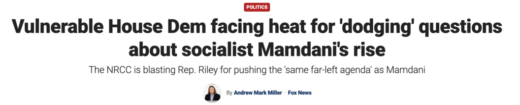 “Radical Democrat Josh Riley won’t condemn dangerous socialist Zohran Mamdani because he can’t – they share the same donors, vendors and endorsements. In other words, Zohran Mamdani and Josh Riley are one and the same.” – NRCC Spokeswoman Maureen O’Toole