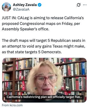“This is a brazen, backroom power grab by power-hungry Gavin Newsom and his loyal foot soldiers like out of touch George Whitesides. They’re gutting independent redistricting, silencing voters, and stacking the deck to protect their jobs. It’s corrupt, it’s cowardly, and California families should be furious.” – NRCC Spokesman Christian Martinez