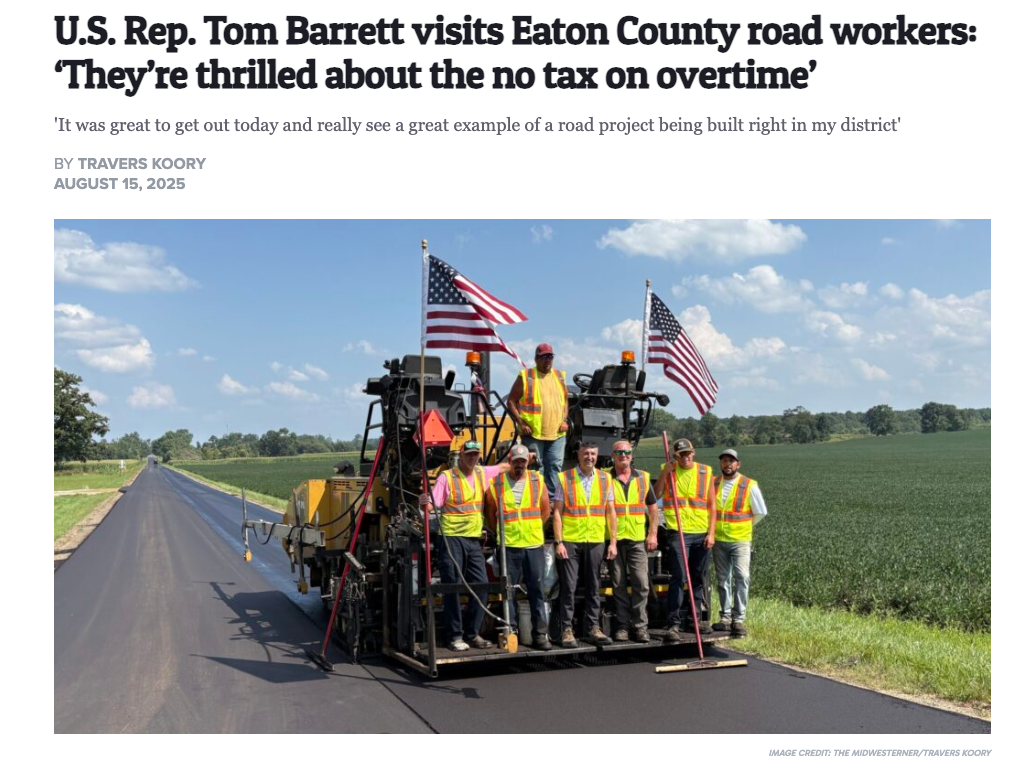 Congressman Tom Barrett toured a road project in Eaton County, speaking with crews and riding on both a paver and a steam roller, while promoting the commonsense results like no tax on overtime delivered in the One Big Beautiful Bill.