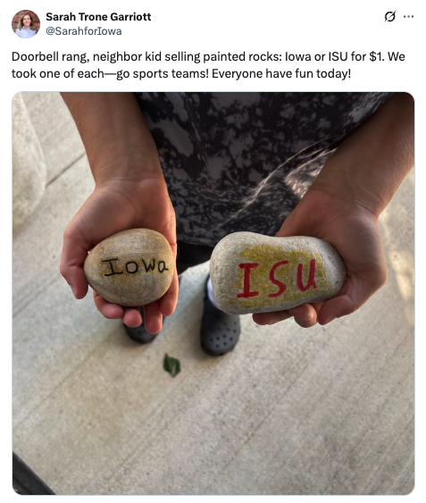 While Iowans were tailgating and watching the CyHawk game, out of touch Sarah Trone Garriott was busy fumbling her message on Twitter with a half-hearted “go sports! Everyone have fun today!” line.