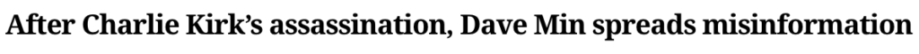 Unhinged lunatic Dave Min has spent SIX straight days peddling lies and conspiracy theories about Charlie Kirk’s assassination to score cheap political points and when confronted with the truth, he didn’t answer, he ran. Now even his hometown newspaper is calling him out: