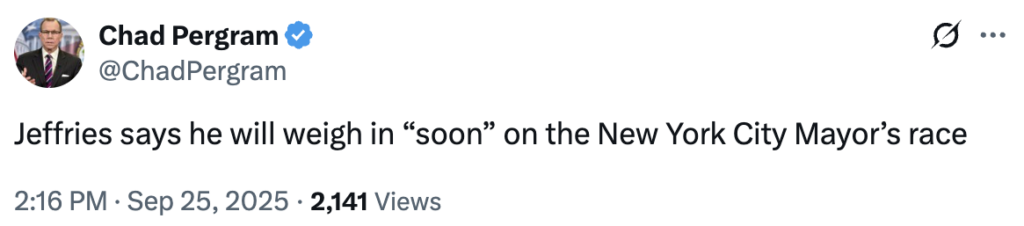 It’s been 93 days since socialist Zohran Mamdani secured the Democrat Party’s nomination for the NYC race. And with Election Day just 40 days away, so-called “Leader” Hakeem Jeffries still hasn’t endorsed the nominee in his own city.