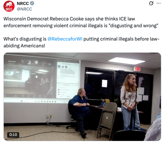 “Rebecca Cooke has made it clear that she stands with the radical far left and criminal illegal immigrants, not Wisconsinites and law enforcement. Radical Rebecca is completely out of touch with western Wisconsin and will be rejected once again.” – NRCC spokesman Zach Bannon