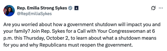 Reminder: Just last year, Emilia Sykes posted, “keep our government open by putting people over politics.”