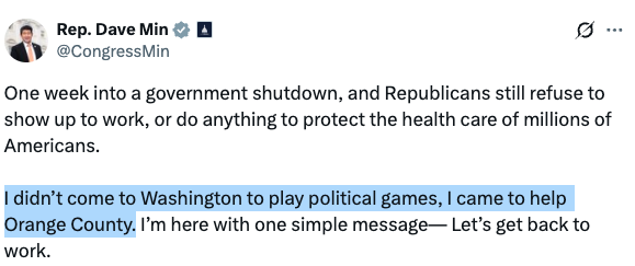 Out of touch Democrat Dave Min tweeted that he “didn’t come to Washington to play political games” after voting to shut down the government, cut off paychecks for California families, and fundraise off the chaos. Min’s hypocrisy would be funny if it weren’t costing people their livelihoods.