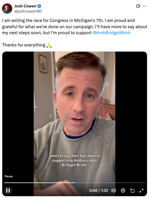 “Democrat Josh Cowen bailed from Michigan’s 7th district Democrat primary clown car but not before endorsing out of town, out of touch Bridget Brink only fueling the Democrats’ chaotic and costly race to the Left.” – NRCC Spokesman Zach Bannon