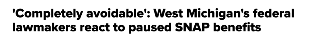 “This shutdown was completely avoidable. The House passed a clean extension of funding on September 19th to keep the government open and provide funding for more than a million Michiganders on SNAP. Senator Slotkin and Senator Peters have now blocked this non-partisan measure 12 times over the past five weeks. It is shameful that Michigan’s Senators are prioritizing politics over paying our troops, over helping low-income Michiganders put food on the table, and over making sure that air-travel is safe and reliable. This ‘politics first’ behavior by our Senators exemplifies why I introduced No Budget, No Pay for Congress legislation.”