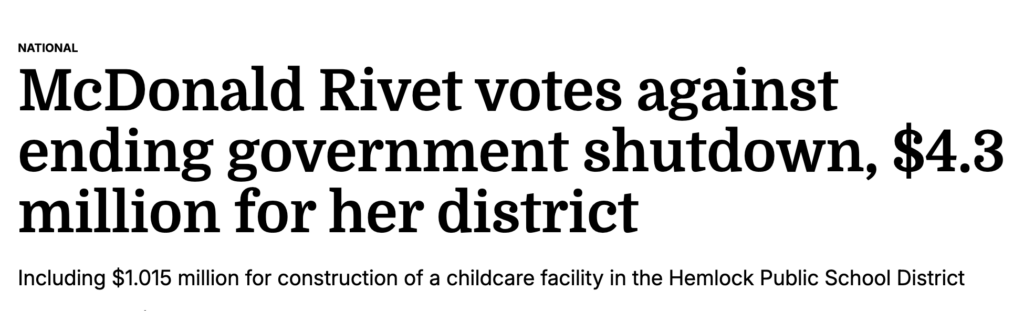 “Out of touch Democrat Kristen McDonald Rivet betrayed mid-Michigan. Her vote against re-opening the government and against millions in funding for Michigan’s 8th congressional district proves she will always put party politics ahead of Michiganders,” said Zach Bannon, spokesman for the National Republican Congressional Committee.