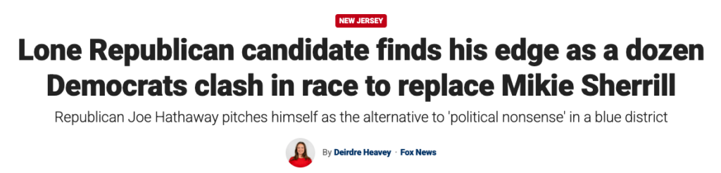 As the only Republican running to replace Gov.-elect Mikie Sherrill in the special election for New Jersey’s 11th Congressional District, Randolph Township Mayor Joe Hathaway has the advantage of not needing to bump elbows in a 12-candidate field like his Democratic counterparts.