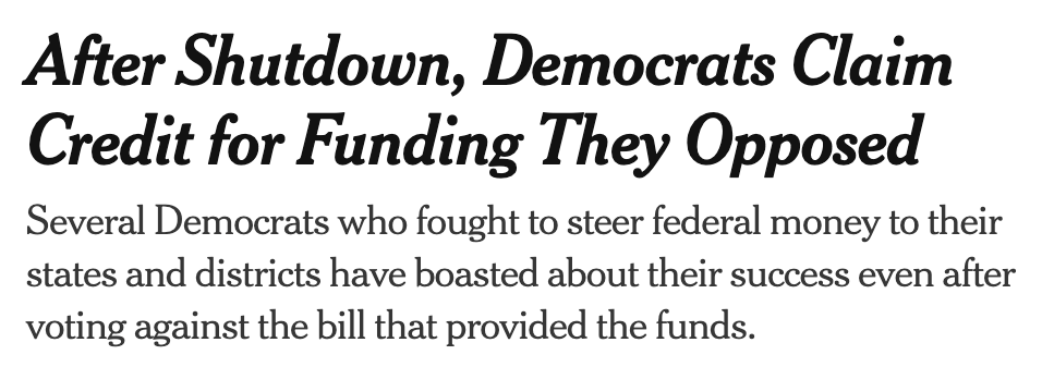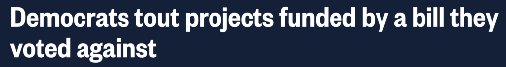 Multiple House Democrats, including Laura Gillen, Josh Riley, Gabe Vasquez, Ted Lieu, April McClain Delaney, Donald Norcross, and Rick Larsen, are now shamelessly taking credit for district funding projects made possible by the continuing resolution they voted against.