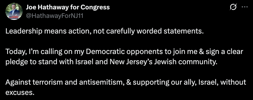 Joe Hathaway Calls on NJ-11 Dems to Sign Pro-Israel Pledge