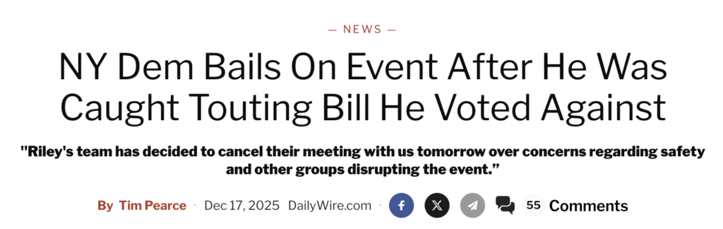 “Now that out of touch Democrat Josh Riley has been exposed for trying to block critical funding for his own district, he’s refusing to face the very people he tried to hurt with his vote. Riley is a total fraud and a coward.” — NRCC Spokeswoman Maureen O’Toole