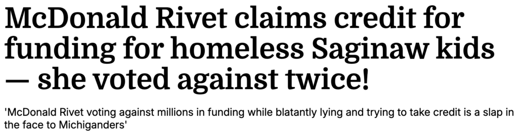 “Kristen McDonald Rivet is a lying, soulless scumbag who shamelessly takes credit for funding homeless kids after directly voting AGAINST it. Michiganders are sick and tired of her scam charade.” — NRCC Spokesman Zach Bannon