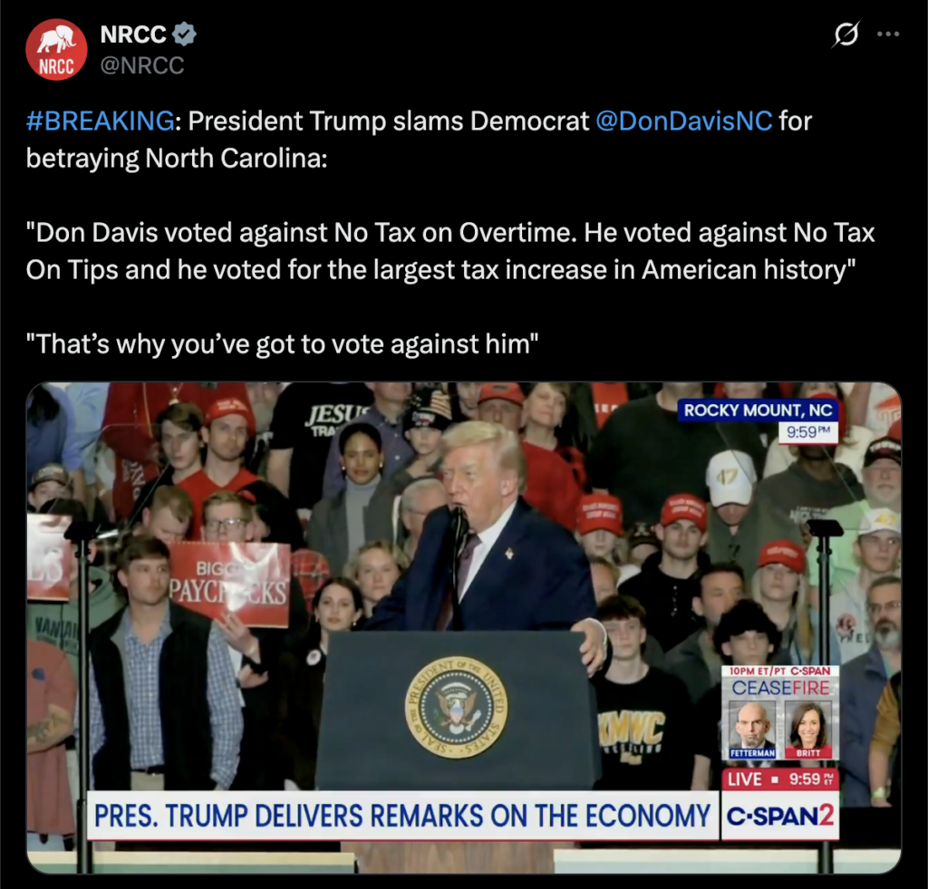 In case you missed it, President Trump tore into out of touch Democrat Don Davis in Rocky Mount last week. Davis has consistently stood in the way of the commonsense agenda North Carolinians voted for, including historic tax relief, a secure border, and keeping men out of women’s sports.