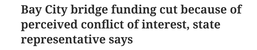 Nearly $2 million in funding for the Bay City bridge is delayed due to out of touch Democrat Kristen McDonald Rivet’s conflict of interest with her husband.