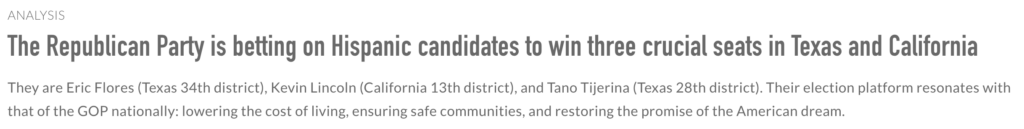 “Republicans aren’t just talking about earning Hispanic voters’ trust, we’re continuing to work and build it. Outstanding candidates like Kevin Lincoln reflect their communities, understand the challenges working families face, and are stepping up to help grow a House majority focused on opportunity, security, and the American Dream.” – NRCC Spokesman Christian Martinez