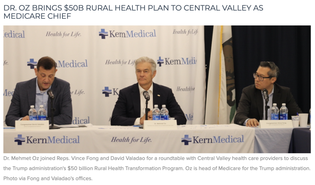 Now administrator of the Centers for Medicare & Medicaid Services, Oz joined Reps. Vince Fong and David Valadao for a roundtable with Central Valley health care providers at the Kern Medical hospital campus to discuss the Trump administration’s $50 billion Rural Health Transformation Program — a five-year initiative aimed at strengthening rural hospitals and expanding access to care.