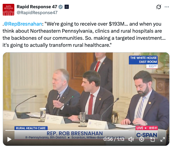 “Congressman Rob Bresnahan voted to deliver more than $193 million to protect rural health care in Pennsylvania. That vote means hospitals stay open, care stays local, and families get the services they need without leaving their communities. Results matter, and Bresnahan delivered.” – NRCC Spokesman Reilly Richardson
