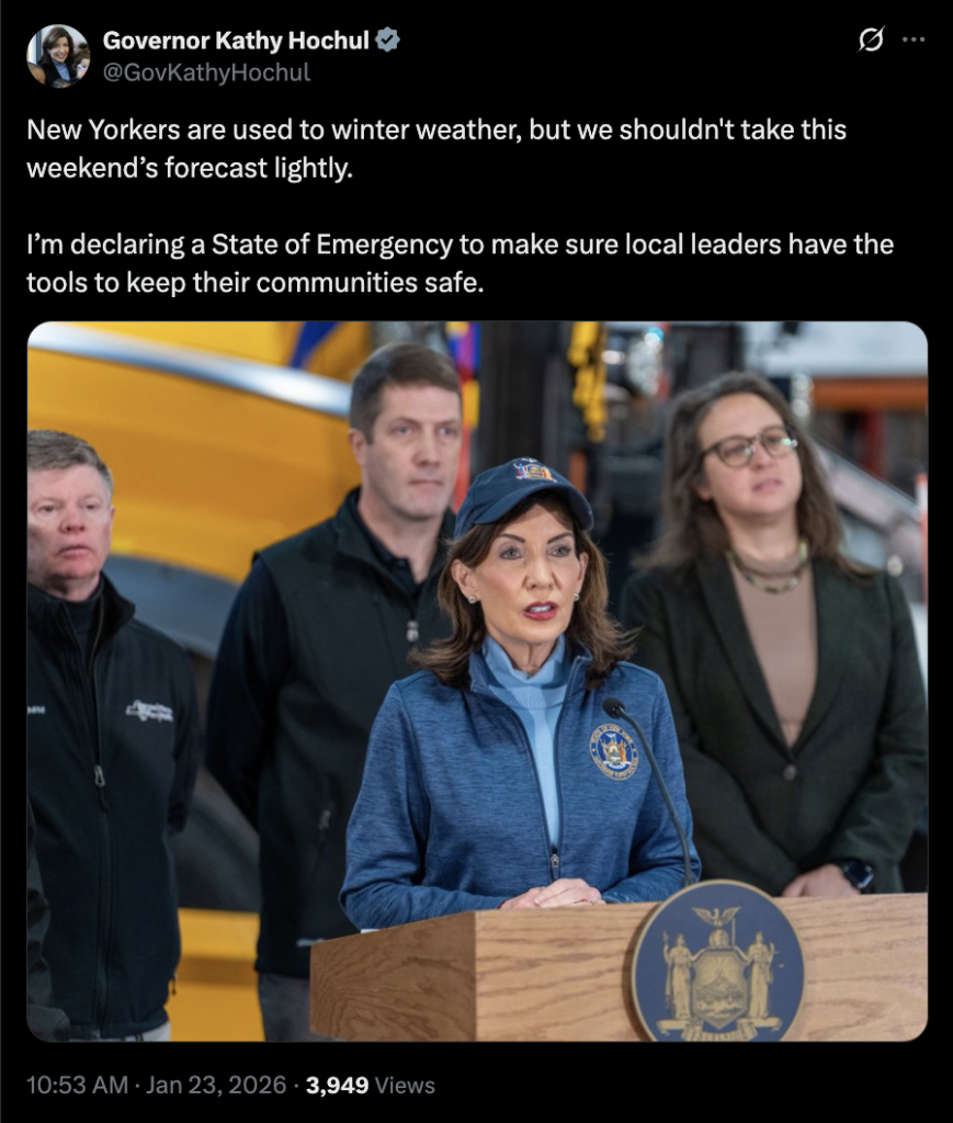 Kathy Hochul just declared a State of Emergency across New York due to the dangerous winter storm forecasted for this weekend.