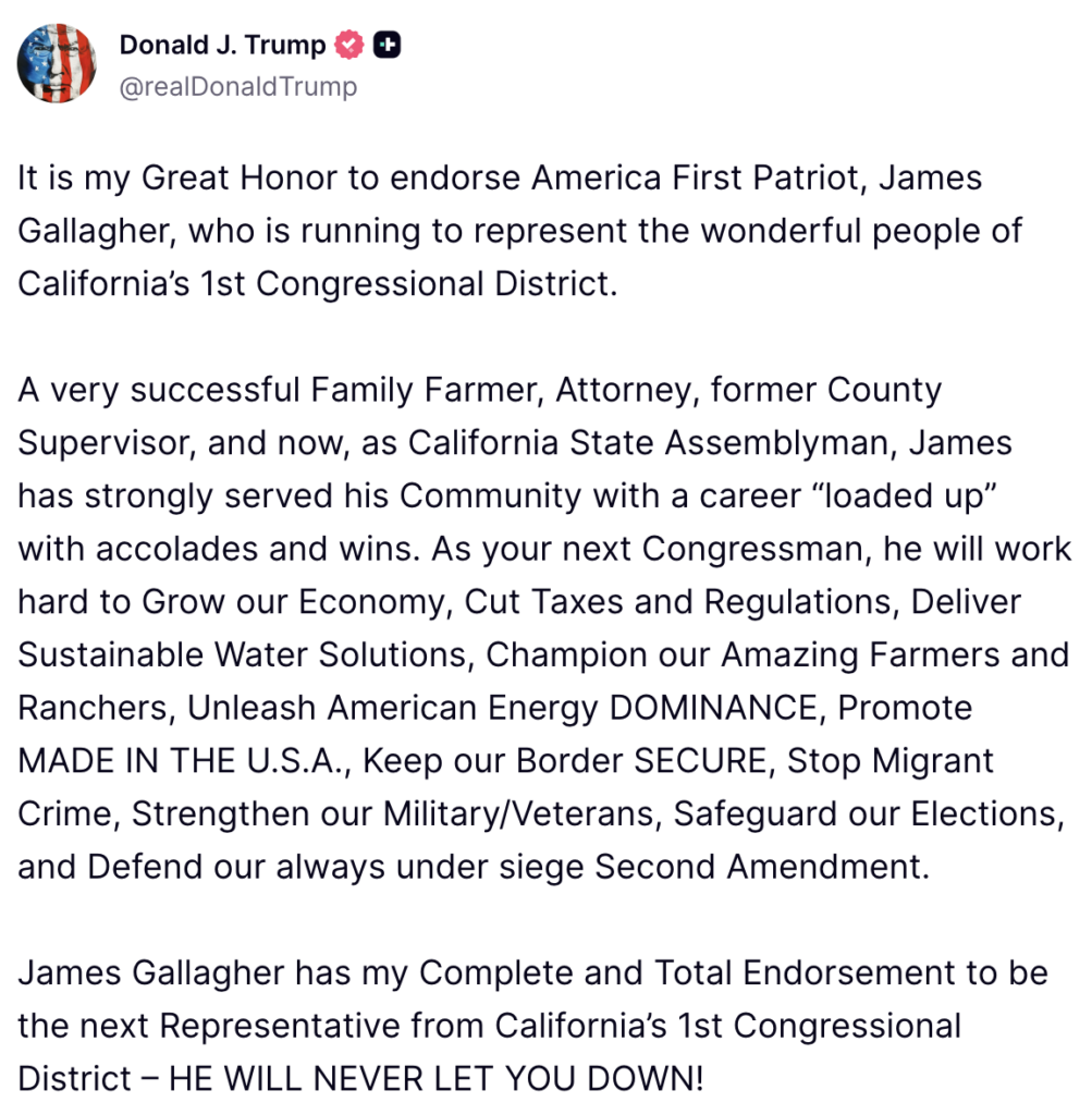 President Donald J. Trump just endorsed Republican Assemblymember James Gallagher in California’s 1st District: