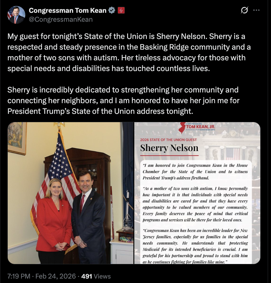 In case you missed it, Congressman Tom Kean Jr. hosted special needs advocate Sherry Nelson for the President’s State of the Union address last night.