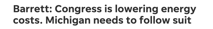 Congressman Tom Barrett penned an op-ed highlighting his work to boost energy production and lower costs for Michiganders while calling on Michigan Democrats to follow suit.