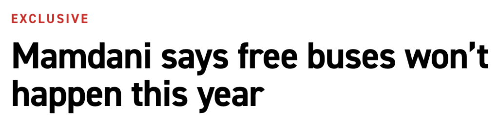 After promising the moon, Mamdani is now admitting that one of his signature ideas, free buses, can’t even get off the ground this year.