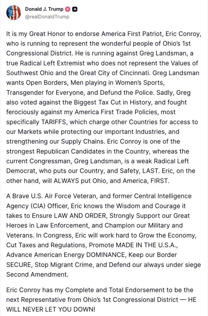 President Trump just gave Eric Conroy his “Complete and Total Endorsement” for his bid for Congress in Ohio’s 1st Congressional District.