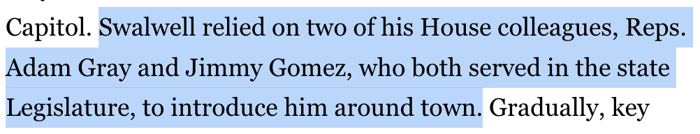 During his gubernatorial campaign, Swalwell leaned heavily on his campaign co-chair, Adam Gray, to introduce him across California and vouch for him with local leaders.