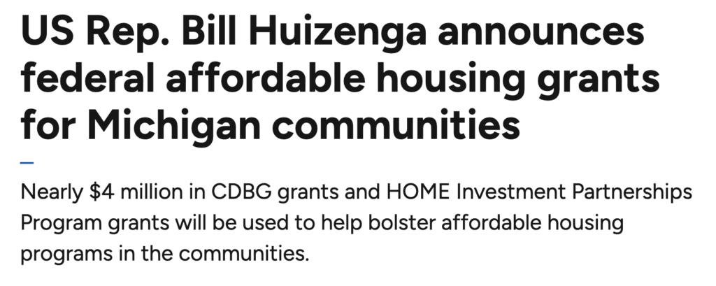 Congressman Bill Huizenga announced nearly $4M in federal grants for communities across Southwest Michigan to improve housing affordability and housing availability for lower- and middle-income families.