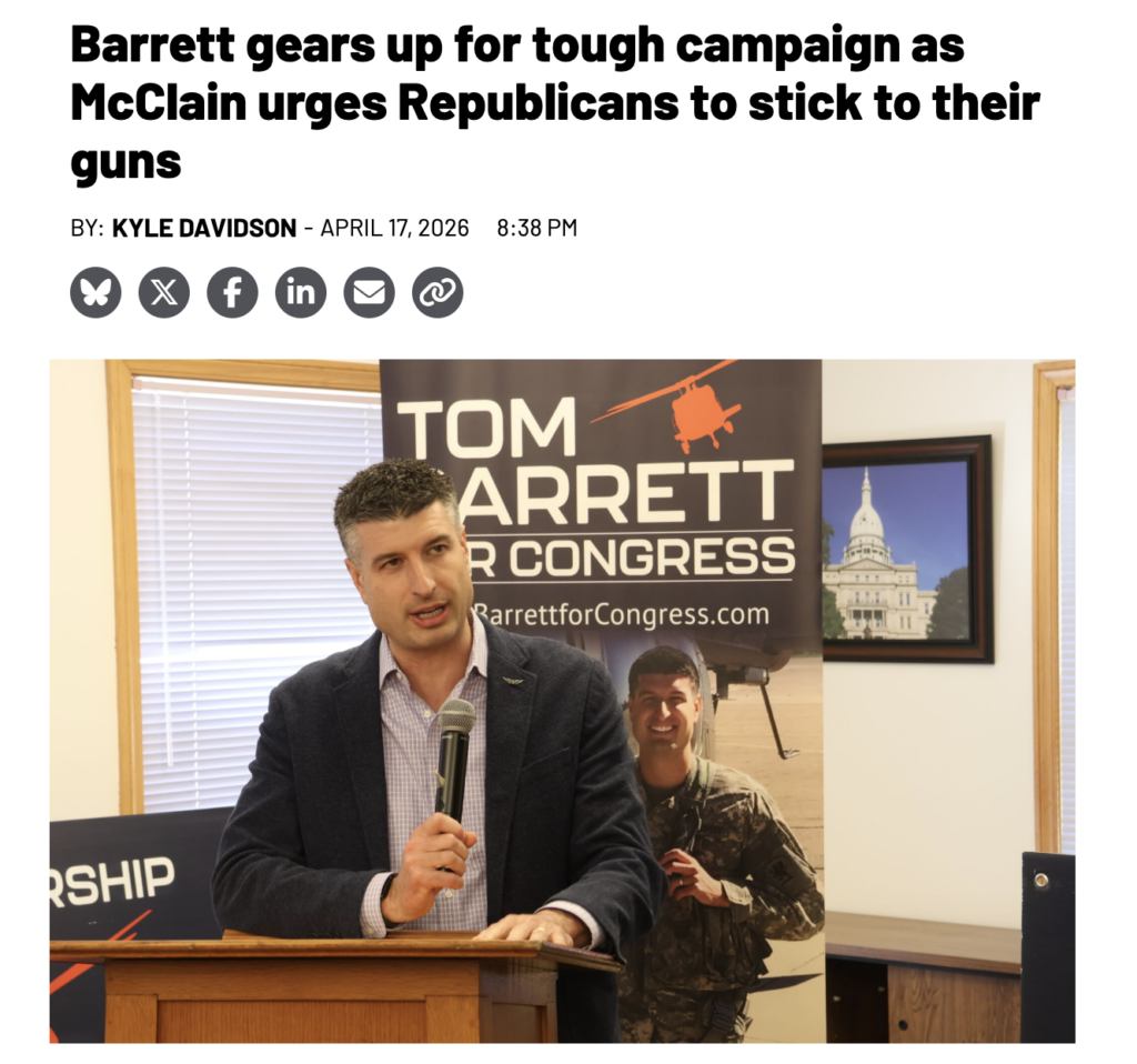 “22-year U.S. Army veteran and helicopter pilot Tom Barrett fought to protect our nation overseas and now he is fighting for Mid-Michigan in Congress. Michiganders are fired up to send Barrett back to Washington this fall.” – NRCC Spokesman Zach Bannon