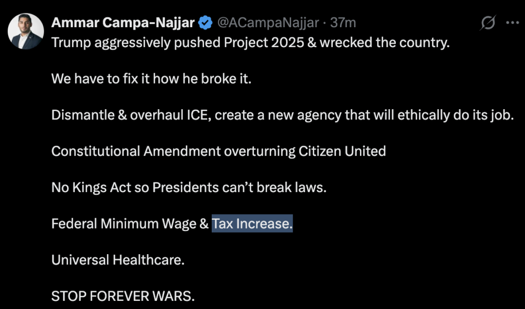 Failed perennial socialist Ammar Campa-Najjar is now openly campaigning on “Tax Increase” messaging after every House Democrat voted for the largest tax increase since World War II.